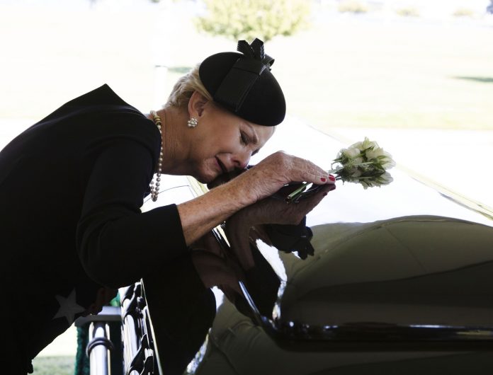 Begravelsesfølget gikk i prosesjon etter kisten til hans siste hvilested. Senatoren begraves ved siden av sin beste venn og romkamerat fra dagene ved Annapolis, Chuck Larson, på en gresskledd bakketopp med utsikt over Severn River.