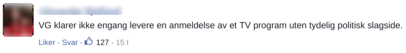 – VG klarer ikke engang levere en anmeldelse av et TV program uten tydelig politisk slagside, skriver en oppgitt leser med flest likes.