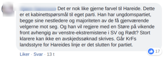 – Det er nok like gjerne farvel til Hareide. Dette er et kabinettspørsmål til eget parti. Han har ungdomspartiet, begge sine nestledere og majoriteten av de få gjenværende velgerne mot seg. Og han vil regjere med en Støre på vikende front avhengig av venstre-ekstremistene i SV og Rødt? Stort klarere kan ikke en avskjedssøknad skrives. Går KrFs landsstyre for Hareides linje er det slutten for partiet, skriver en annen.