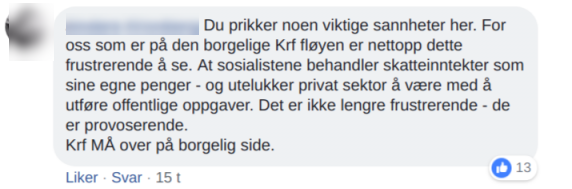 – Du prikker noen viktige sannheter her. For oss som er på den borgelige Krf fløyen er nettopp dette frustrerende å se. At sosialistene behandler skatteinntekter som sine egne penger – og utelukker privat sektor å være med å utføre offentlige oppgaver. Det er ikke lengre frustrerende – de er provoserende, skriver en person.