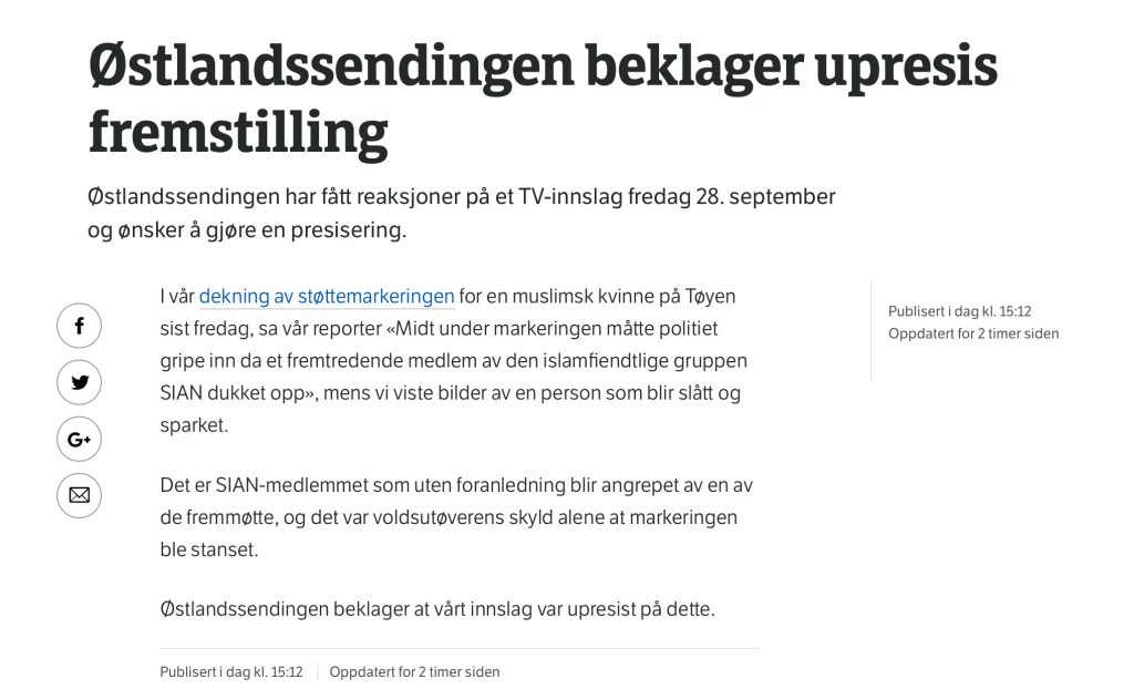 «I vår dekning av støttemarkeringen for en muslimsk kvinne på Tøyen sist fredag, sa vår reporter «Midt under markeringen måtte politiet gripe inn da et fremtredende medlem av den islamfiendtlige gruppen SIAN dukket opp», mens vi viste bilder av en person som blir slått og sparket.