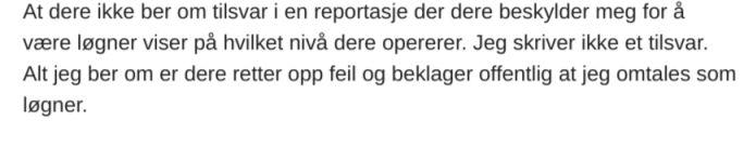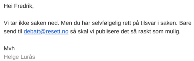 – Ser at mannen som ønsker å kalle seg redaktør, Helge Lurås og hans nettblekke Resett nok en gang dikter opp en story for å sverte mitt renome. Som vanlig dikter og lyver de om hva jeg har skrevet og sagt, og gir meg heller ikke mulighet til samtidig tilsvar.