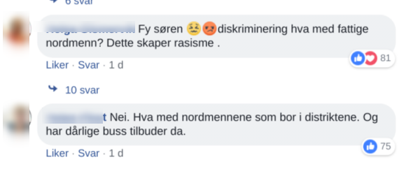 – Fy søren, diskriminering. Hva med fattige nordmenn? Dette skaper rasisme, skriver en eldre dame på facebook.