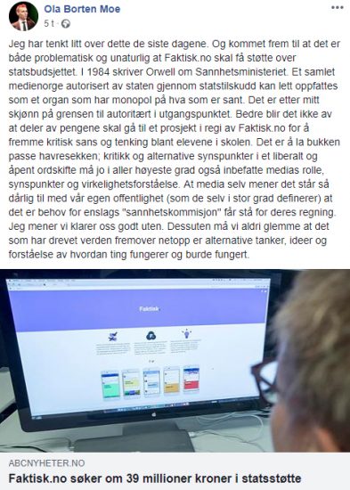 – Jeg har tenkt litt over dette de siste dagene. Og kommet frem til at det er både problematisk og unaturlig at Faktisk.no skal få støtte over statsbudsjettet. I 1984 skriver Orwell om Sannhetsministeriet. Et samlet medienorge autorisert av staten gjennom statstilskudd kan lett oppfattes som et organ som har monopol på hva som er sant. Det er etter mitt skjønn på grensen til autoritært i utgangspunktet. Bedre blir det ikke av at deler av pengene skal gå til et prosjekt i regi av Faktisk.no for å fremme kritisk sans og tenking blant elevene i skolen. Det er å la bukken passe havresekken; kritikk og alternative synspunkter i et liberalt og åpent ordskifte må jo i aller høyeste grad også innebefatte medias rolle, synspunkter og virkelighetsforståelse. At media selv mener det står så dårlig til med vår egen offentlighet (som de selv i stor grad definerer) at det er behov for en slags «sannhetskommisjon» får stå for deres regning. Jeg mener vi klarer oss godt uten. Dessuten må vi aldri glemme at det som har drevet verden fremover nettopp er alternative tanker, ideer og forståelse av hvordan ting fungerer og burde fungert, skriver Ola Borten Moe.
