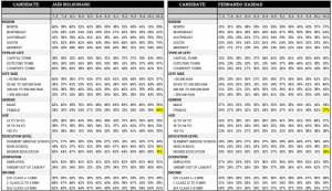 På den ene siden står Jair Bolsonaro – en tidligere militæroffiser. Han er på mange måter en rebell i brasilianske politikk og står godt plantet på høyresiden hvor han leder det liberalsosiale partiet Partido Social Liberal (PSL). Selv om han har sittet i den brasilianske nasjonalforsamlingen siden 1991 blir han sett på som outsider. Bolsonaro har gått til valg på ultra-liberal økonomisk politikk i Chicago-skolens ånd, samt ved å fremme tradisjonelle (kristne) konservative sosiale verdier.