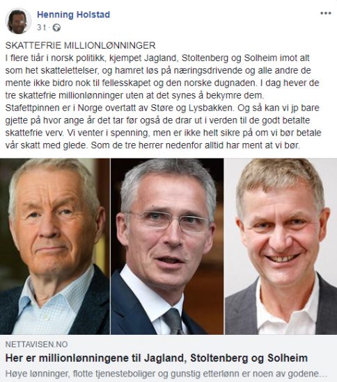 I flere tiår i norsk politikk, kjempet Jagland, Stoltenberg og Solheim imot alt som het skattelettelser, og hamret løs på næringsdrivende og alle andre de mente ikke bidro nok til fellesskapet og den norske dugnaden. I dag hever de tre skattefrie millionlønninger uten at det synes å bekymre dem.