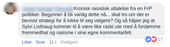 – Kronisk rasistisk uttalelse fra en FrP politiker. Og så håper jeg at Sylvi Listhaug kommer til å være like raskt ute med å fordømme fremmedhat og rasisme i sine egne kommentarfelt, skrev en tredjeperson.