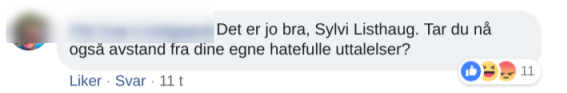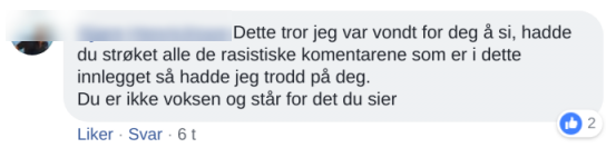– Dette tror jeg var vondt for deg å si, hadde du strøket alle de rasistiske kommentarene som er i dette innlegget så hadde jeg trodd på deg. Du er ikke voksen og står for det du sier, skrev en som ikke tror på Listhaug i hennes eget kommentarfelt.