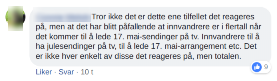 – Tror ikke det er dette ene tilfellet det reageres på, men at det har blitt påfallende at innvandrere er i flertall når det kommer til å lede 17. mai-sendinger på tv. Innvandrere til å ha julesendinger på tv, til å lede 17. mai-arrangement etc. Det er ikke hver enkelt av disse det reageres på, men totalen, svares det.