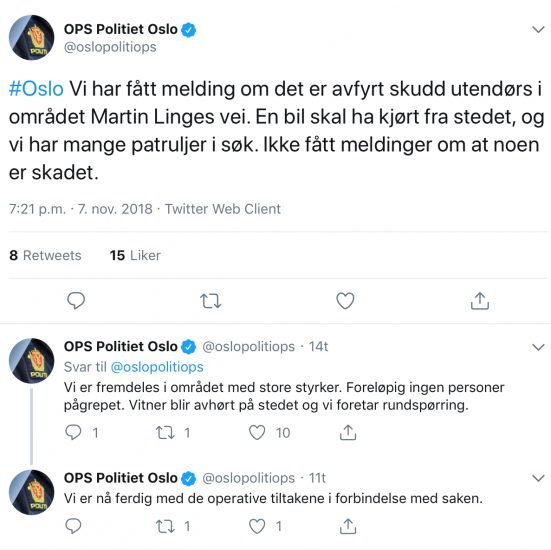 – Vi fikk melding om hendelsen klokken 19, og vi jobber nå ut fra at det er blitt løsnet skudd, sa operasjonsleder Marianne Havenstrøm i Oslo politidistrikt til TV2.