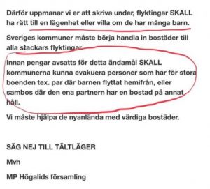 The campaign originally concerns how Swedish local communities must now begin to buy homes for the refugees; according to the initiators of the campaign, refugees «are entitled to a flat or a house if they have several children».