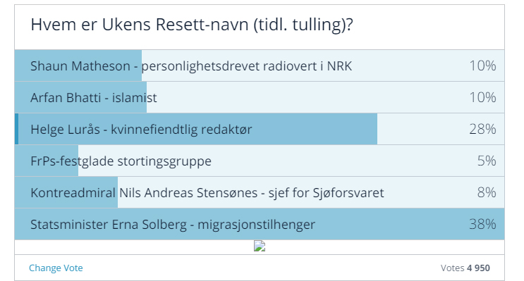 Seieren gikk til Statsminister Erna Solberg – migrasjonstilhenger, med hele 38 %, eller 1875 stemmer. Hun vil få tilsendt en t-skjorte med et berømt (unevnelig) sitat fra sin egen kulturminister Trine Skei Grande.