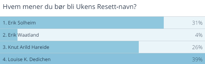 I en hektisk nominasjonsrunde til Ukens Resett-navn har våre lesere stemt på sine favoritter. Vi kom med fire forslag, og kommentarfeltet synes at kandidatene denne uken var gode, unntatt en.