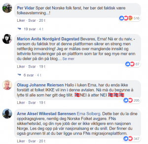 – Good heavens, Erna! How naive you are if you really believe this platform will secure a strict but just immigration! I am speechless because of your lack of insight and superficial formulations on a platform encompassing far more than what you are now sharing on your blog, one writes and another ones adds that Erna does not give a damn for the Norwegian people.