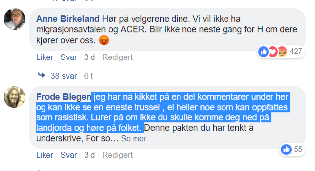 – Jeg har nå kikket på en del kommentarer under her og kan ikke se en eneste trussel , ei heller noe som kan oppfattes som rasistisk. Lurer på om ikke du skulle komme deg ned på landjorda og høre på folket, skrives det.