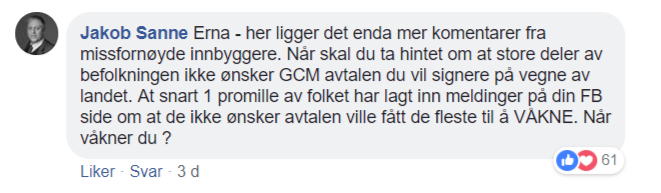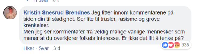 – Jeg titter innom kommentarene på siden din til stadighet. Ser lite til trusler, rasisme og grove krenkelser. Men jeg ser kommentarer fra veldig mange vanlige mennesker som mener at du overkjører folkets interesse. Er ikke det litt å tenke på, spør en person.
