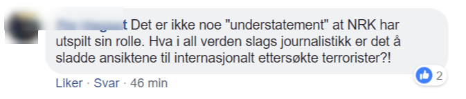 – Det er ikke noe «understatement» at NRK har utspilt sin rolle. Hva i all verden slags journalistikk er det å sladde ansiktene til internasjonalt ettersøkte terrorister, spurte en annen.
