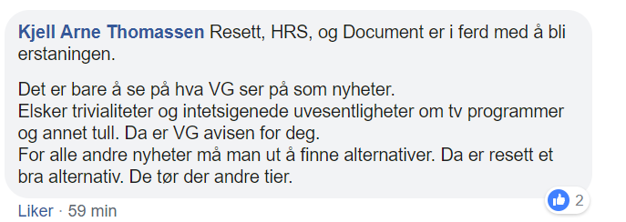 – Resett, HRS, og Document er i ferd med å bli erstaningen. Det er bare å se på hva VG ser på som nyheter. Elsker trivialiteter og intetsigenede uvesentligheter om tv programmer og annet tull. Da er VG avisen for deg. For alle andre nyheter må man ut å finne alternativer. Da er resett et bra alternativ. De tør der andre tier, skriver en person.