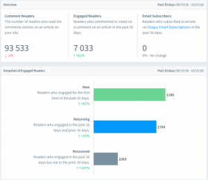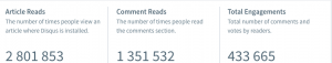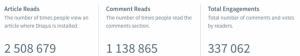 Disse tallene innebærer en vekst på 10,5 % i antall leste artikler; en vekst på 15,8 % i antall leste kommentarer; og en vekst på 22,3 % i antall engasjementer (antall kommentarer publisert pluss antall opp- og nedstemminger)