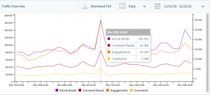 I perioden 22. november-22. desember, har Resett slått en rekord med hele 5388 kommentarer lagt ut på en dag. Dette skjedde den 5. desember 2018, da debatten rundt FNs migrasjonspakt raste for fullt.