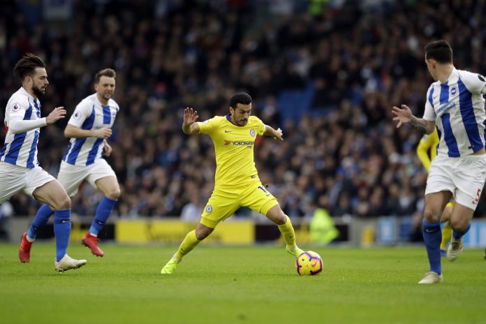 En Chelsea-supporter er bøtelagt og utestengt fra fotballkamper i flere år etter å ha ropt homofobiske utsagn i Chelseas bortekamp mot Brighton i desember i fjor. På bildet har London-lagets Pedro ballen mellom flere Brighton-spillere fra den aktuelle kampen. Foto: AP Photo / Matt Dunham / NTB scanpix.