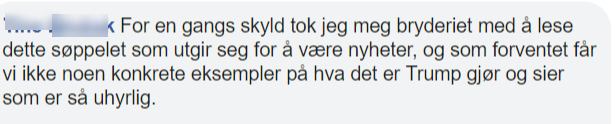 – For en gangs skyld tok jeg meg bryderiet med å lese dette søppelet som utgir seg for å være nyheter, og som forventet får vi ikke noen konkrete eksempler på hva det er Trump gjør og sier som er så uhyrlig, skriver en mann oppgitt.