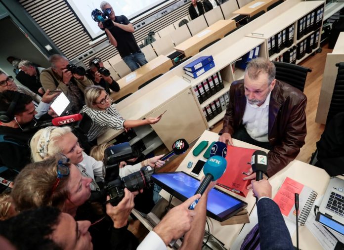 Eirik Jensen i møte med pressen på den første dagen av ankesaken i Borgarting lagmannsrett 28. august. Tirsdag starter prosedyrene. Foto: Lise Åserud / NTB scanpix