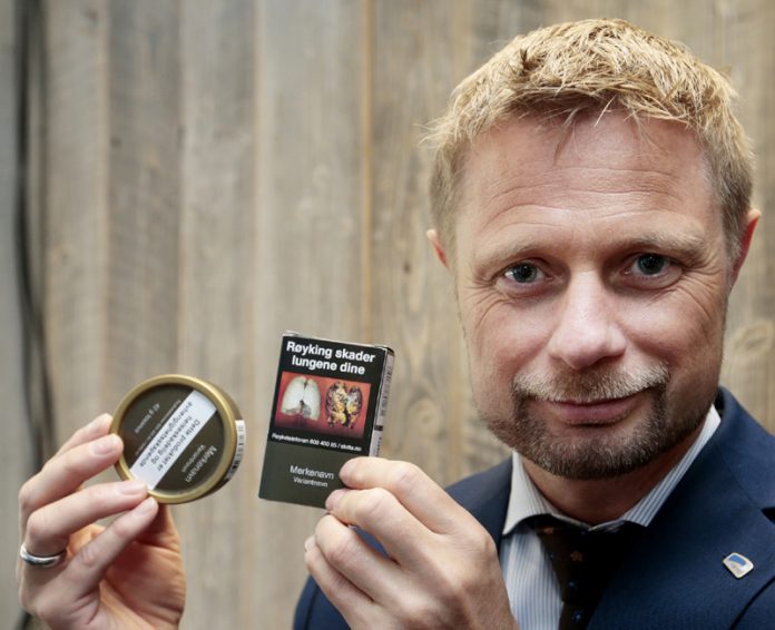 Helseminister Bent Høie (H) viser hvordan røykpakker og snusesker vil se uti framtiden: Standardisert utseende uten informasjon om smak, styrke, produksjonsdato osv. Verdens tobakksfrie dag markeres med nyheter om standardiserte pakninger i Oslo tirsdag morgen.