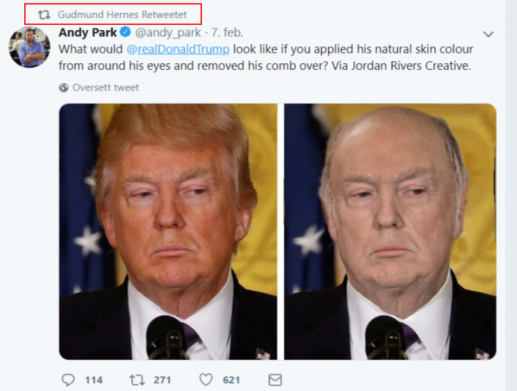 – Hvordan ville Trump ha sett ut hvis han hadde hatt normal hudfarge og fjernet hårfrisyren, lød den hånlige twitter-meldingen som Hernes likte og delte på sin profil.