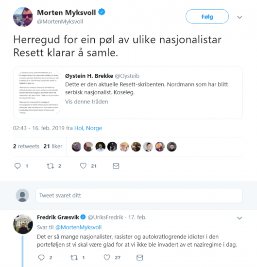 – Herregud for ein pøl av ulike nasjonalistar Resett klarar å samle, tvitrer Myksvoll.