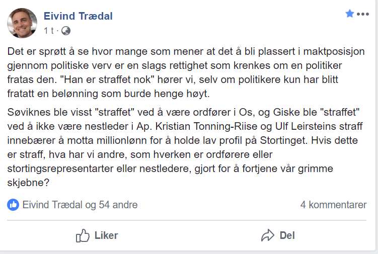 – Søviknes ble visst «straffet» ved å være ordfører i Os, og Giske ble «straffet» ved å ikke være nestleder i Ap. Kristian Tonning-Riise og Ulf Leirsteins straff innebærer å motta millionlønn for å holde lav profil på Stortinget. Hvis dette er straff, hva har vi andre, som hverken er ordførere eller stortingsrepresentarter eller nestledere, gjort for å fortjene vår grimme skjebne, spør Trædal til sine egne følgere.