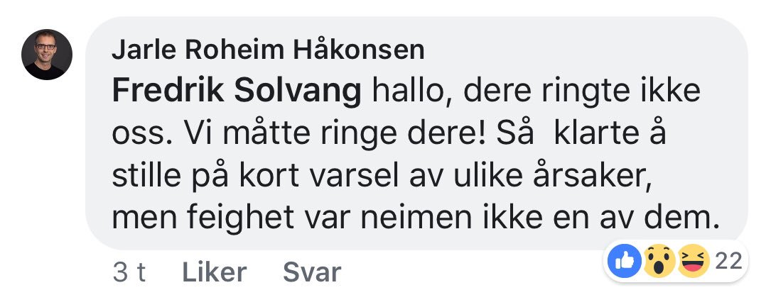 – Hallo, dere ringte ikke oss. Vi måtte ringe dere! Så klarte ingen å stille på kort varsel av ulike årsaker, men feighet var neimen ikke en av dem, skrev Håkonsen på Facebook etter Ap-kritikken.
