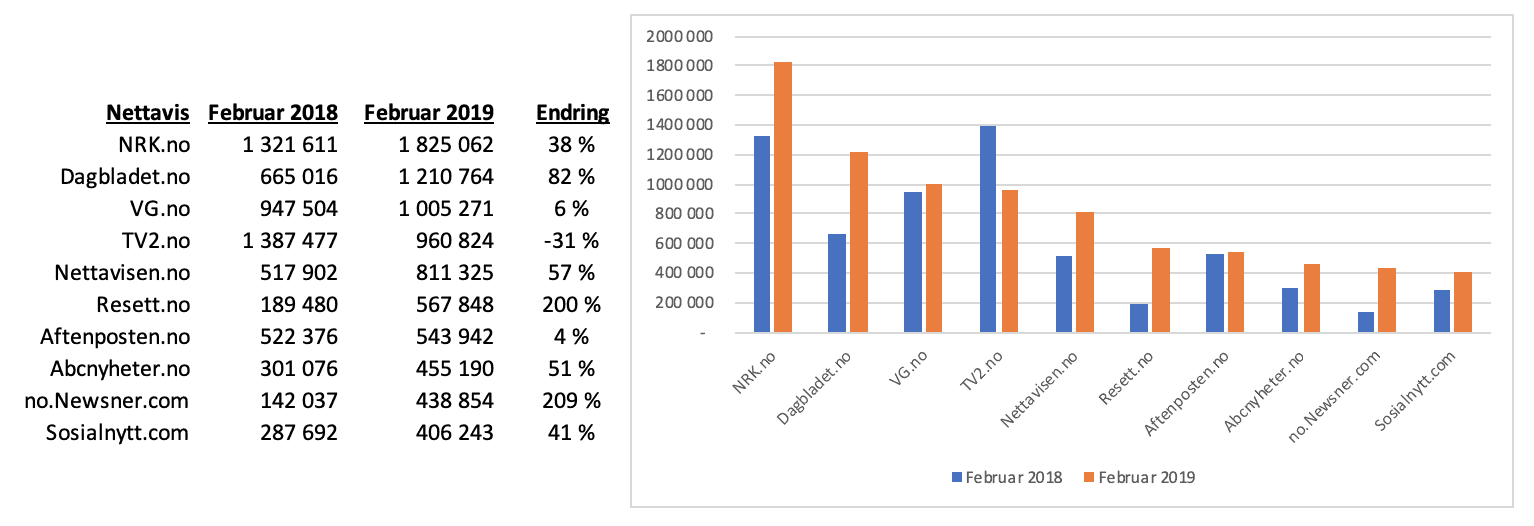 Veksten for Resett har vært betydelig, og sammenlignet med februar 2018 er det snakk om en vekst på 200 prosent. Det betyr at antall delinger faktisk har blitt tredoblet. Kun Newsner hadde større vekst (209 prosent).