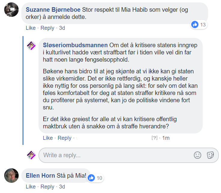 – Resett laget en sak om meg der kommentarene fikk løpe fritt. Det var rasistiske og islamofobe kommentarer. Det er derfor jeg vil anmelde dette. Det er rasisme, og det skal man være på vakt for. Resett har et ansvar for kommentarfeltet, de skal redigere det, og man ser hva de tillater, uttalte hun til nettstedet Scenekunst i forbindelse med politianmeldelsen.