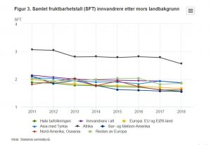 I 2018 ble SFT for innvandrerkvinner fra Afrika målt til 2,55. Det er riktignok en nedgang fra 3,06 i 2011, men er likevel skyhøyt over etnisk norske kvinner (1,50). SFT for innvandrerkvinner fra Asia og EU/EØS-landene var henholdsvis 1,86 og 1,66.