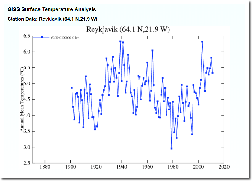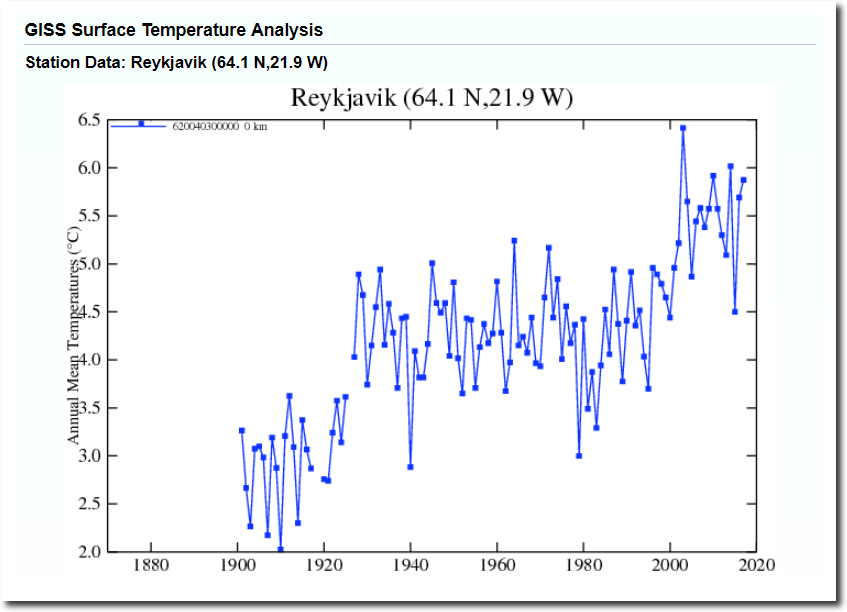 Det samme gjelder Island. Temperaturdata fra Reykjavik viser en varmetopp rundt 1940 og deretter et temperaturfall på flere grader frem mot slutten av 1970-tallet. Men etter at NASA foretok temperaturjusteringer, er dette temperaturfallet forsvunnet. Istedenfor viser NASA en temperaturstigning i Reykjavik siden 1940 på med flere grader.