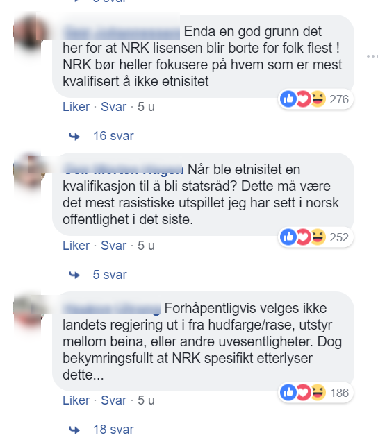 – Enda en god grunn det her for at NRK lisensen blir borte for folk flest! NRK bør heller fokusere på hvem som er mest kvalifisert å ikke etnisitet, raser en kvinne som har fått flest likes på sin kommentar.