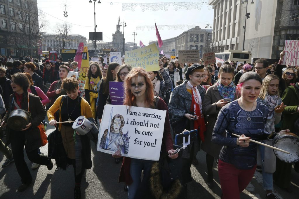 300 kvinner hadde samlet seg på Mykhailivska-plassen i sentrum av Kiev mens noen titall ytre høyre-demonstranter sto i nærheten med plakater som sa «Gud, fedreland, patriotisme» og «Feminismen ødelegger ukrainske familier».
