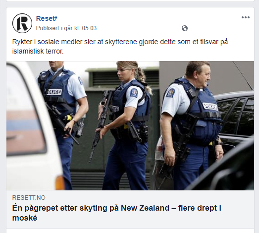 – Helt ukritisk deler bloggen Resett en sak. «Rykter i sosiale medier sier at skytterne gjorde dette som et tilsvar på islamistisk terror» skriver de over innlegget.
