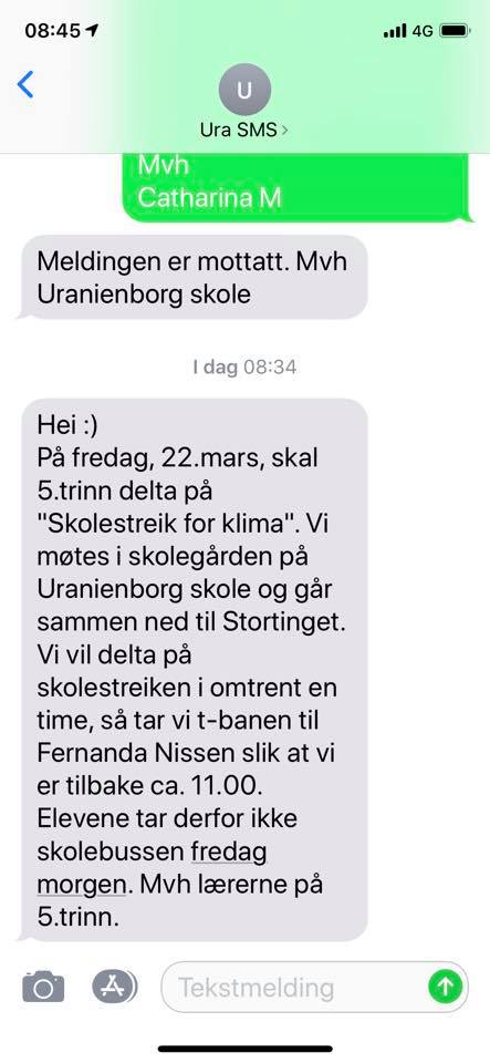 Hun kan opplyse om at lærere på femte trinn ved Uranienborg skole «har tatt initiativ til» at elevene skal delta på den såkalte skolestreiken. Det skal være sendt ut en en SMS som informerer om dette, fra skolens ansatte til elevenes foresatte. Den aktuelle meldingen kan leses i skjermdumpen nedenfor.