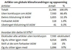 Vedlagte tabell laget av Kjell Erik Eilertsen viser den reelle fordelingen av vitenskapelige artikler og deres konklusjoner om AGW = anthropogenic global warming = menneskeskapt global oppvarming