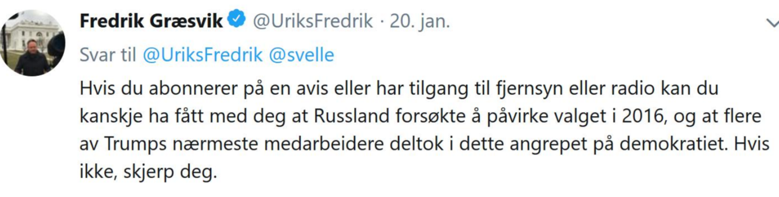 – Hvis du abonnerer på en avis eller har tilgang til fjernsyn eller radio kan du kanskje ha fått med deg at Russland forsøkte å påvirke valget i 2016, og at flere av Trumps medarbeidere deltok i dette angrepet, skrev Græsvik.