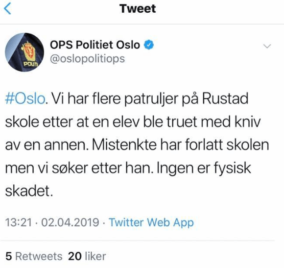 Thorkildsen sikter til en nylig Twitter-melding fra Oslopolitiet, som beskrev en situasjon ved en skole i Oslo, der de måtte rykke ut fordi en elev hadde truet andre elever med kniv.