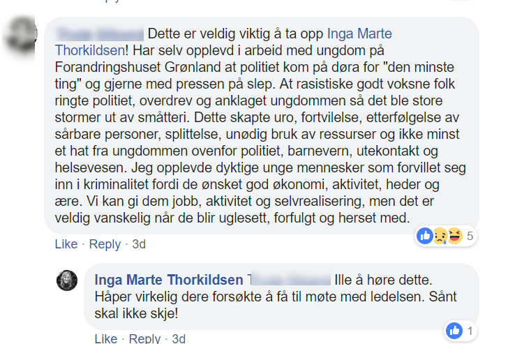 I kommentarfeltet under Thorkildsens innlegg er det imidlertid politiet som får skylda for at barna vokser opp til å bli kriminelle.