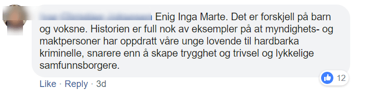 – Enig Inga Marte. Det er forskjell på barn og voksne. Historien er full nok av eksempler på at myndighets- og maktpersoner har oppdratt våre unge lovende til hardbarka kriminelle, snarere enn å skape trygghet og trivsel og lykkelige samfunnsborgere.