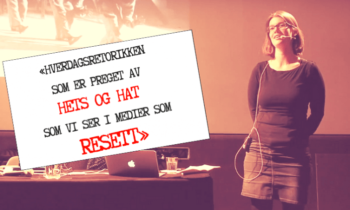 Scenekunstner Amundsen retter deretter fokuset mot de som sprer «hat» i Norge. Hun trekker frem Resett som pådriver i det hun sammenligner avisen med den greske kongen Oidipus.