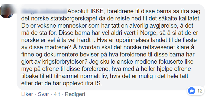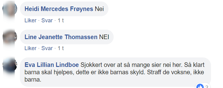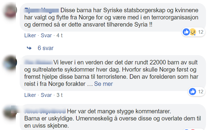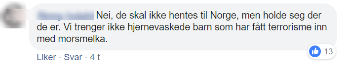 – De har ansvar for sine egne unger. De har selv satt seg i situasjonen og deltatt i en avskyelig terrororganisasjon. Da skal vi heller hjelpe ofrene etter morderpakket, skriver en annen.
