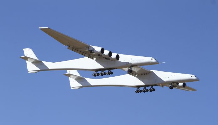 Det enorme flyet har to skrog og seks motorer som tilsvarer dem som sitter på en Boeing 747 Jumbojet. Tanken er at raketten som skal frakte satellitter ut i rommet, ska henge mellom de to flykroppene på Stratolaunch.