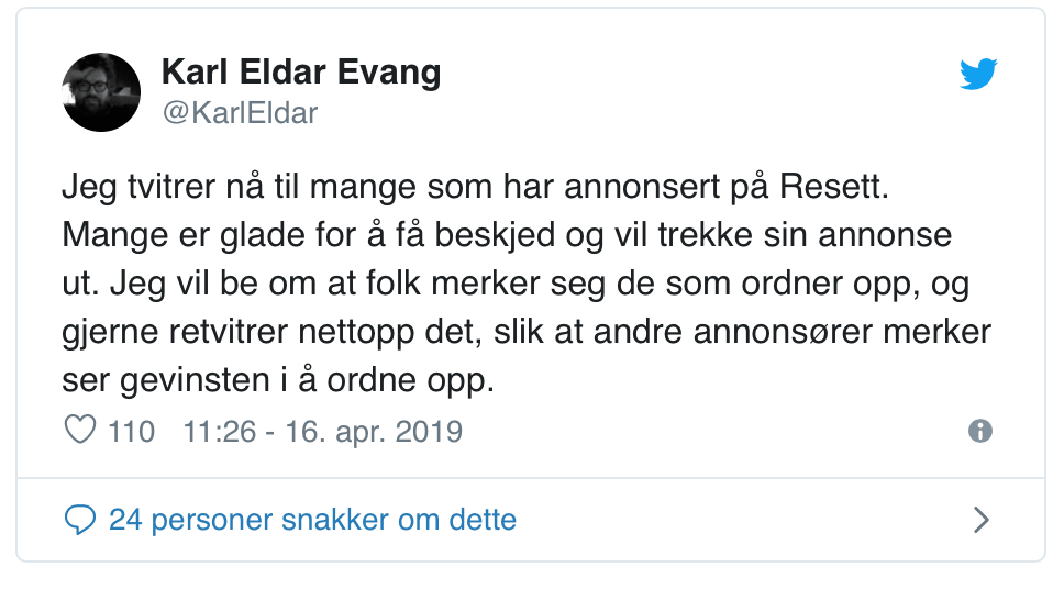 – Det nytter å si fra til annonsører på Resett. Nå har også #Notar Eiendom sagt at de skal ordne opp! Det har også @BN_Bolig , @NorgesEnergi, @HiMolde gjort, skriver han på Twitter.