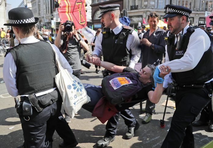 Politiet har forsøkt å få demonstrantene til å holde seg på ett sted – Marble Arch ved Hyde Park – uten særlig hell. Protestaksjonene fortsatte påskeaften på tross av at politiet fjernet den rosa seilbåten som hadde fungert som et naturlig samlingspunkt for demonstrantene.